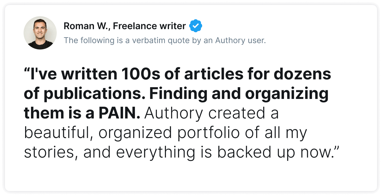 Join thousands of other freelance writers, and spend more time writing and less time worrying about your portfolio. Let Authory do the work for you!
